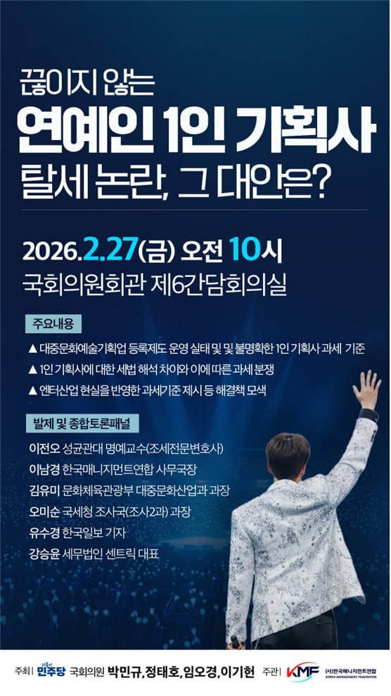 최근 유명 연예인들 1인 기획사 세워놓고 세금 떼먹는 논란 많으니까 국회에서 제도 개선하겠다고 토론회 열었대. 박민규 의원이 주최함. 솔직히 돈 엄청 버는 연예인들이 세금 꼼수 부리는 거 보면 개빡치는데, 이번 기회에 싹 다 잡아서 참교육 좀 해줬으면;;