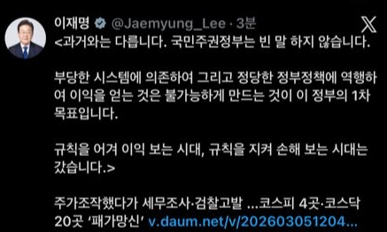 이 대통령이 주가조작 등 규칙 어겨서 이익 보는 시대는 끝났다고 엄장 놓음. 과거랑 다르게 국민주권정부는 빈말 안 한다고 못 박았대. 증시 변동성 심한 상황에서 금융시장 교란 행위 확실히 잡겠다는 의지인 듯. 과연 진짜 패가망신시킬지 팝콘 각이다.